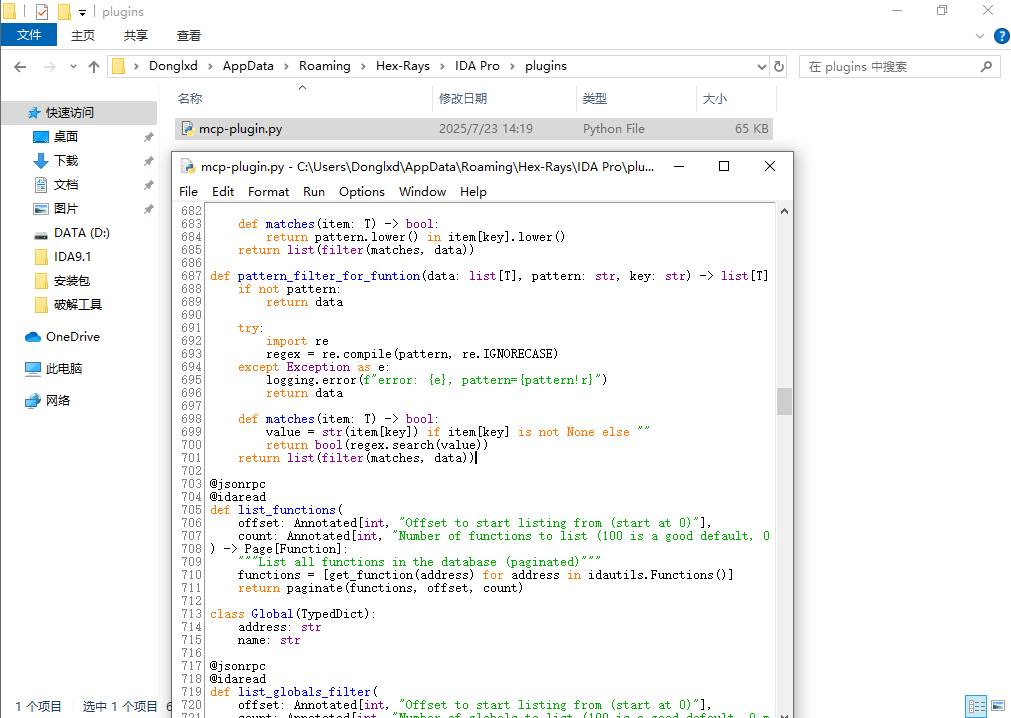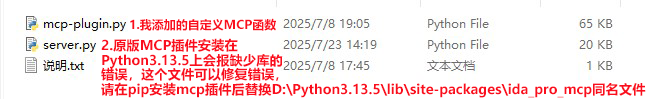 3.上面的"自定义函数补丁"文件夹内容如下图,"mcp-plugin.py"这个文件里编写了所有mcp服务的函数,cline客户端可以通过mcp服务器,来调用这些mcp函数,以便查询分析各种ida数据,比如查询函数名称、函数调用关系等等,而我在试用mcp函数时,发现在新版的cline中,调用批量查询函数名的功能不能使用,提示没有此函数(list_functions_filter),所以我根据原始的"mcp-plugin.py"文件添加了一个新的list_functions_filter函数,并根据原始的pattern_filter函数,改造并新建了,能支持多重过滤词的pattern_filter_for_funtion函数,以便list_functions_filter函数调用。