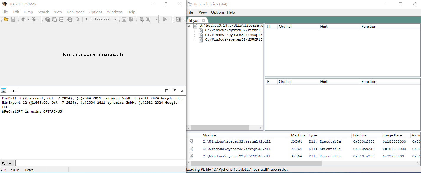 这个安装包我也提供了,在"IDA安装包"的第5项,安装很简单,不再截图,运行后重启IDA,显示成功,左边图中的ida输出没有报错信息,右边的Dependencies查询"libyara.dll"也没有错误,如下图: