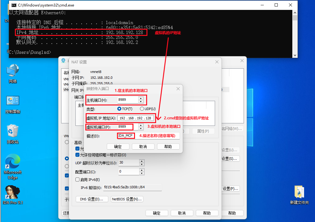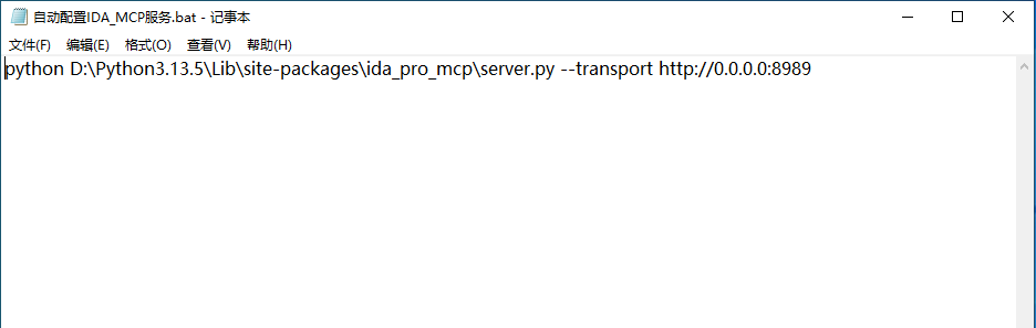 11. 如上的"server.py"其实是一个可以输入参数的配置mcp服务脚本,仔细阅读github的说明和源代码后,发现有两个参数,一个是--ida-rpc参数,这个参数会建立一个本地MCP服务端,比如"--ida-rpc http://127.0.0.1:13337"这样,另一个参数是--transport,调用方法:"--transport http://0.0.0.0:8989",这个参数的作用是开启一个广播mcp的本地端口,而我们需要使用的就是这个参数,我把这个参数编写成了一个批处理程序,每次需要宿主机调用虚拟机的mcp服务器时,运行就行,同时这个批处理运行后,会有一个cmd窗口一直开着,相当于一个web服务器,宿主机发送的所有外部的mcp请求,都会显示在这个cmd窗口中。最后记得ida中的mcp插件也启动一下。