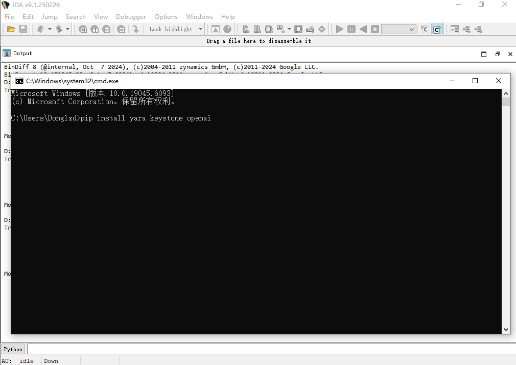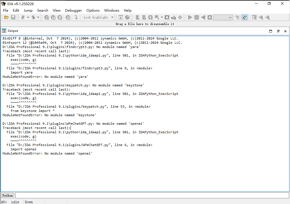 这样上面的库都安装成功了,重新打开IDA9.1主程序,发现之前的报错提示没有了,但是有一些新的报错提示,使用PIP命令继续安装它们: