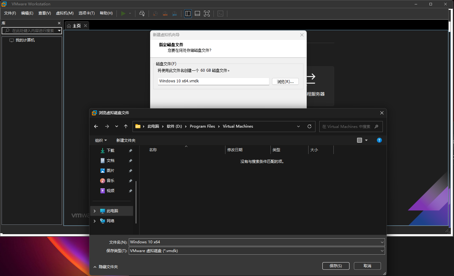 15. 最后选择下刚刚说的磁盘文件vmdk的保存位置,这个文件相当于虚拟机的硬盘,会比较大,请安放在你空余的磁盘上,并留足剩余空间,这步可以给虚拟磁盘起个其他名字,方便自己识别,默认是放在此WIN10虚拟机的文档中,刚刚已经设置过的,最后点击保存,并点击下一步: