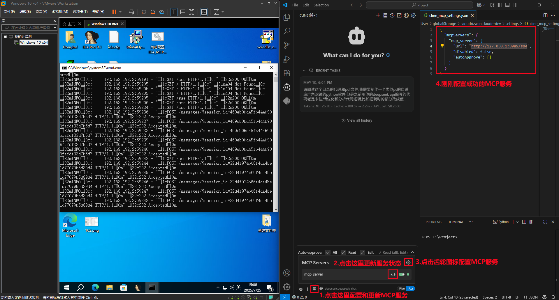 上面高亮标注的就是mcp服务器的配置信息,可以在虚拟机本地安装VScode和Cline,把上面的高亮内容复制到MCP服务的json配置文件中,就可以连接MCP服务器。