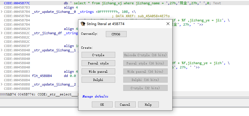 5.可以看到CODE:0045B77C有一个字符串,后半部分没有显示出中文。我们点击String literals窗口中的Currently后的(no string literal),显示"no string literal",说明这个分析文件,我们没有设置过全局的字符串编码格式。