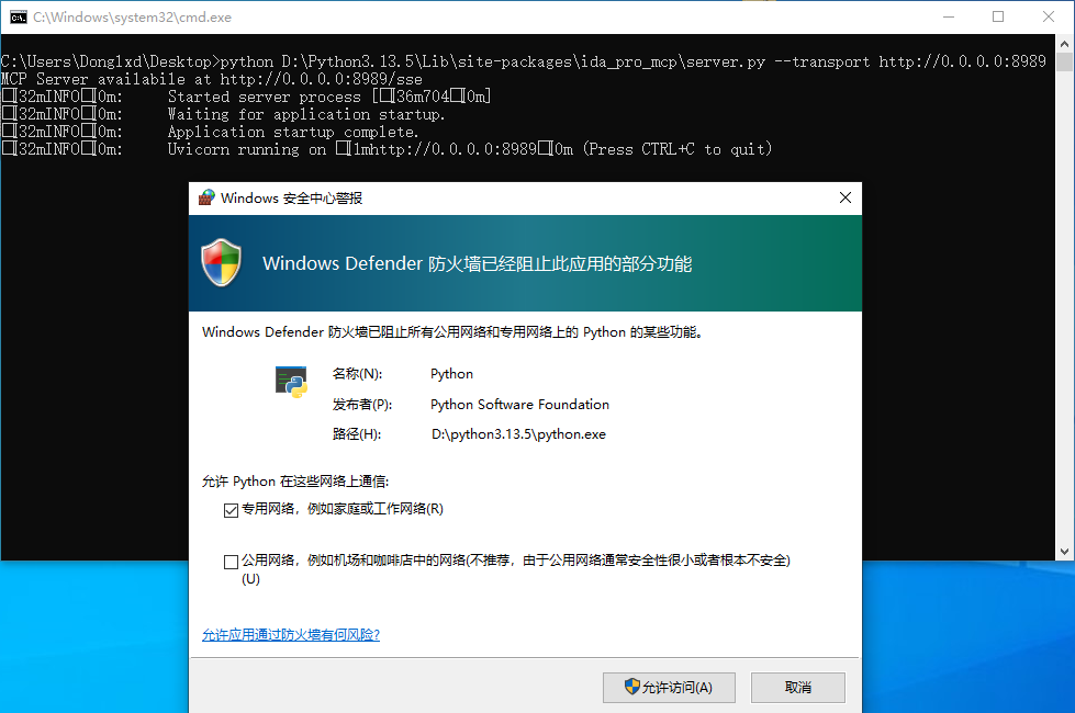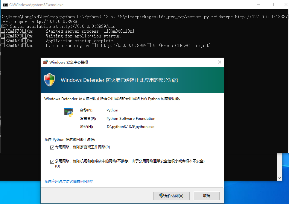 3.第一次启动,可能window防火墙会提示,允许访问即可。如批处理窗口中,没有宿主机的访问信息,建议重置防火墙(netsh advfirewall reset),重新允许上面的mcp服务和批处理,并把下面的允许访问的公用网络勾选上。