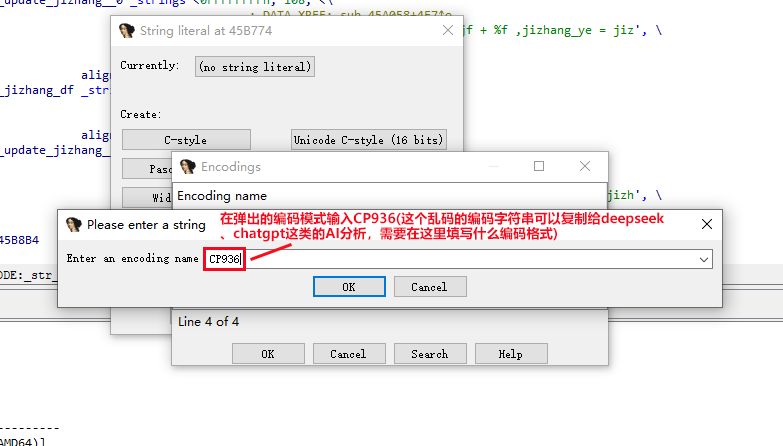7. 然后在编码格式中输入"CP936",如果我们不知道输入什么编码格式,我们可以把ida里的字符串复制给Deekdeep、ChatGPT这类AI分析编码格式。