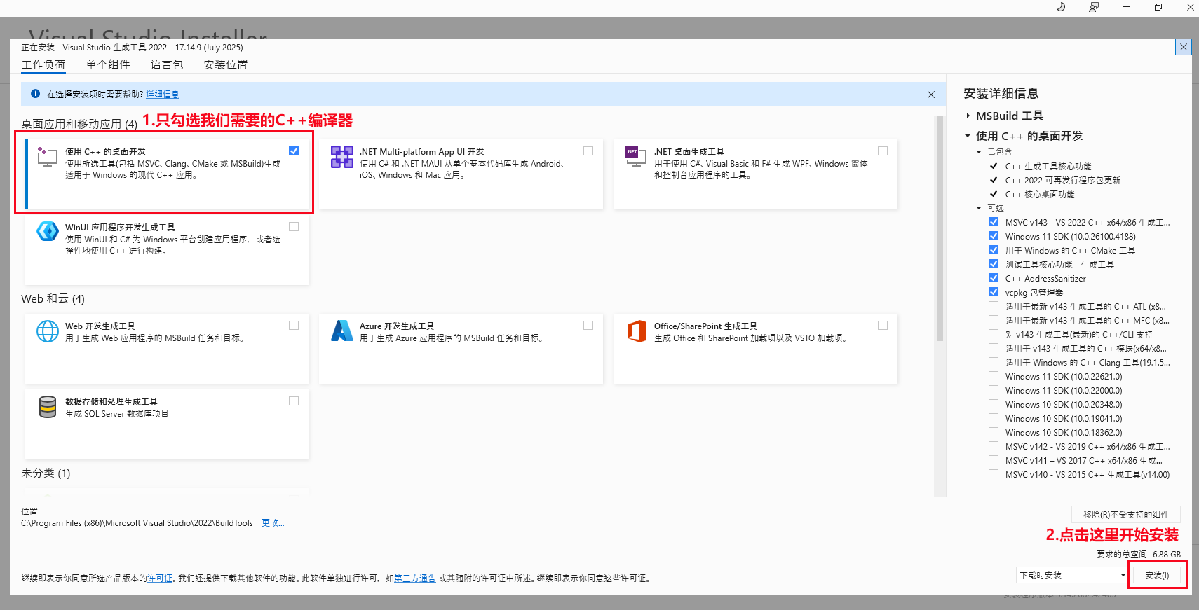 如下图所示,我们只需勾选c++的编译模块即可。勾选后,点击右下角的安装即可。