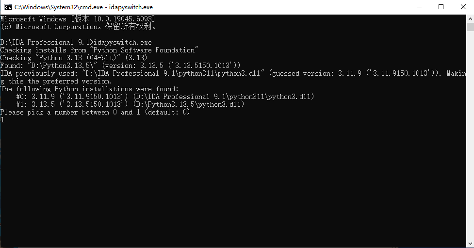 7. 可以看到如下例子,其中找到了两个python,版本分别是3.11.9(东方大佬IDA安装包中自带Python版本)和3.13.5(我之前安装的最新版Python),输入对应需要就行,这里我输入1,然后回车。