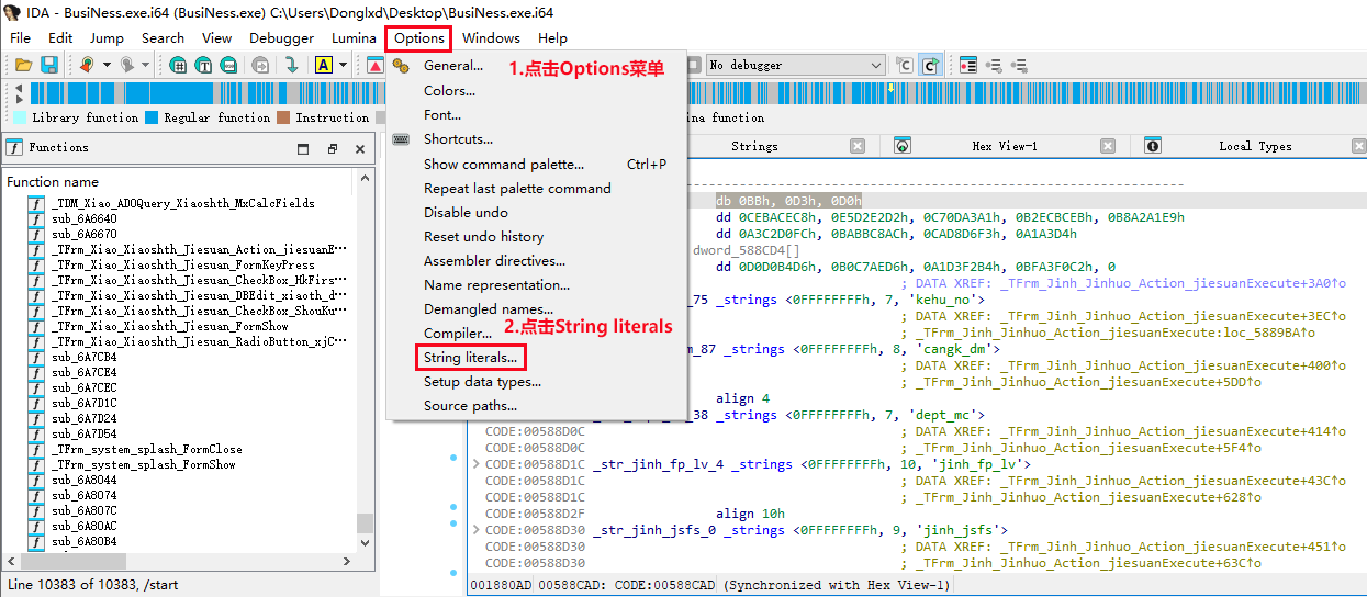 2. 打开"Strings"菜单("View"菜单-"Open subviews"-"Strings")或按快捷键Shift+F12打开