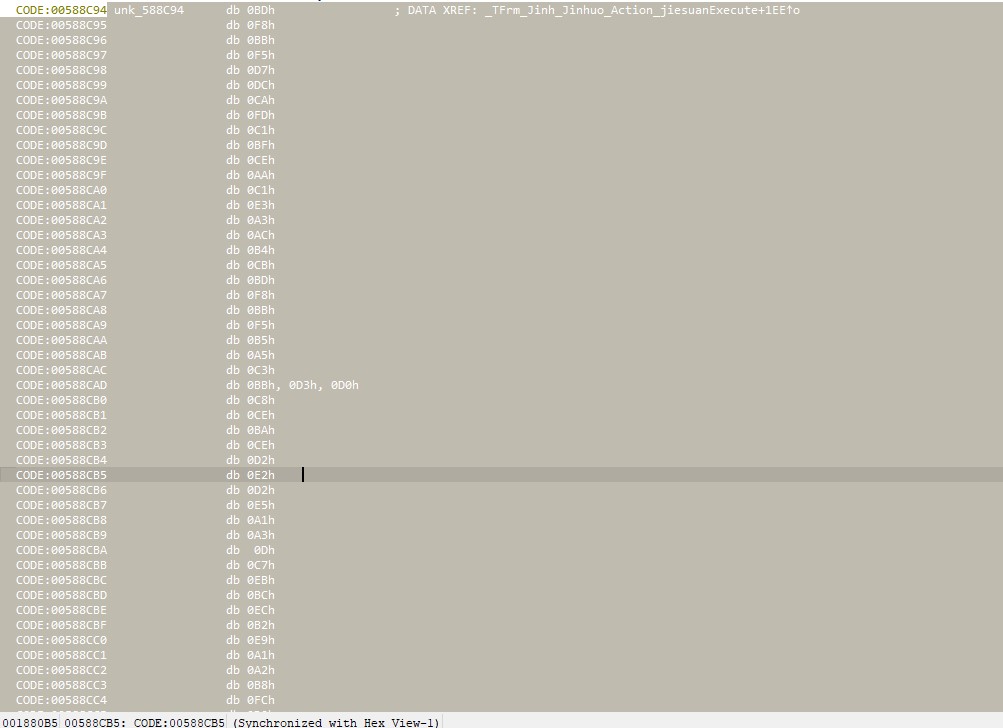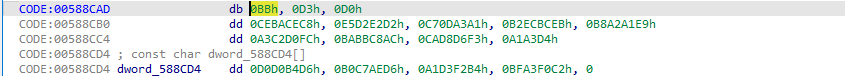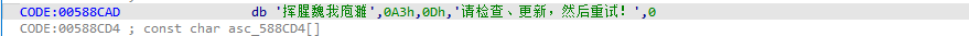 可以看到如下的IDA的00588C94位置被误认成一个函数,点击查看蓝色的DATA XREF调用处,也发现这是一个字符串调用,而不是一个函数的call调用,而这些误认的函数,就是导致乱码不能识别字符串的原因。