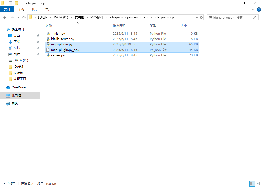 6.然后复制我的补丁包中的"mcp-plugin.py"到原版的"D:MCP插件ida-pro-mcp-mainida-pro-mcp-mainsrc"目录下,可以备份下原始的"mcp-plugin.py",比如我把原版名称"mcp-plugin.py"改成"mcp-plugin.py_bak",如下图: