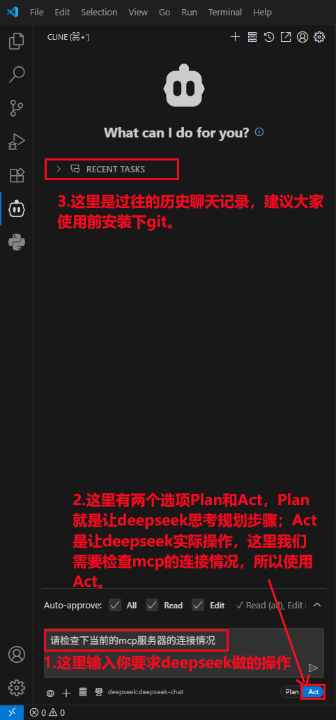 13.请看如下图的Cline使用说明,和Cline调用MCP服务函数时,需要授权的窗口提示,我们点击蓝色的Approve按键授权下,如果不想每次点击,可以点击蓝色按钮上面的Auto-approve把权限赋予Cline。