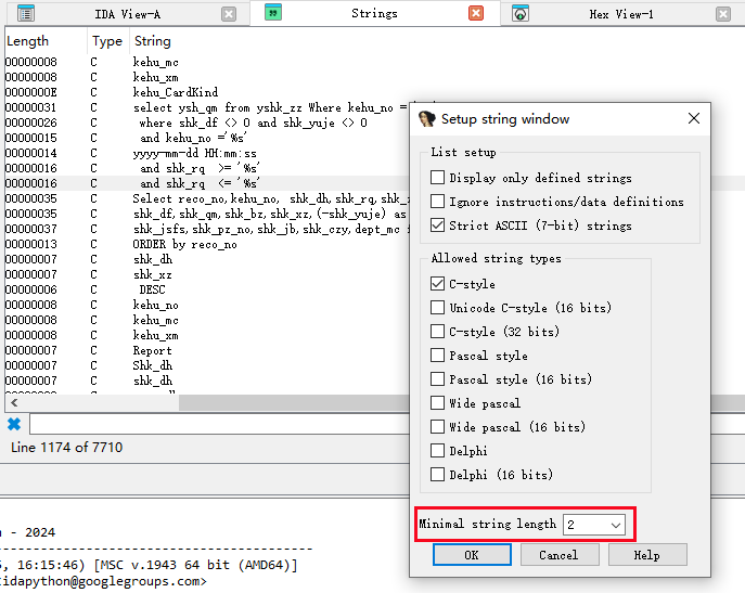 15.经过上面的操作后,如果还有个别短字符串没有识别出来,请按照我之前IDA8.1帖子的方法,设置下最小识别字符串长度( Minimal string length),我们一般设置成2就可以了,最后点击OK确定。