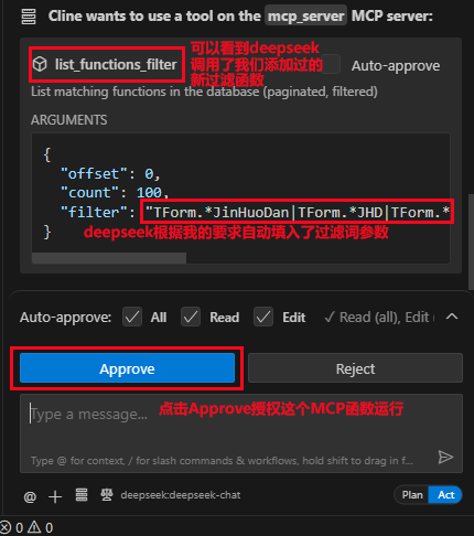 15.可以看到下图,deepseek已经根据我们的要求添加了过滤词来找到需要的函数,并且这个函数是我之前修改添加的新MCP函数。