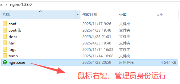 nginx服务器有多种启动方式,这里我采用windows下最简单的方式,选中nginx.exe文件,右键以管理员身份运行。注意直接运行可能也行,采用管理员运行方式更好点。