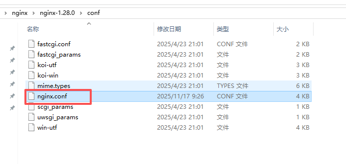 到nginx文件夹的路径下,找到conf - nginx.conf文件进行配置。
