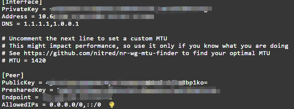 这就是配置文件,把这些复制下来保存到txt改一下conf后缀就能直接在电脑的WireGuard 导入配置连接了。