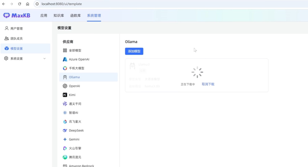 这里由于我们刚刚选择的模型是llama 3,而我们在命令行里面下载的是llama 3.2模型列表里面还没有这个llama3的模型,所以会为我们自动下载。除了Ollama之外,还可以添加其他的模型,方法也都是类似的。