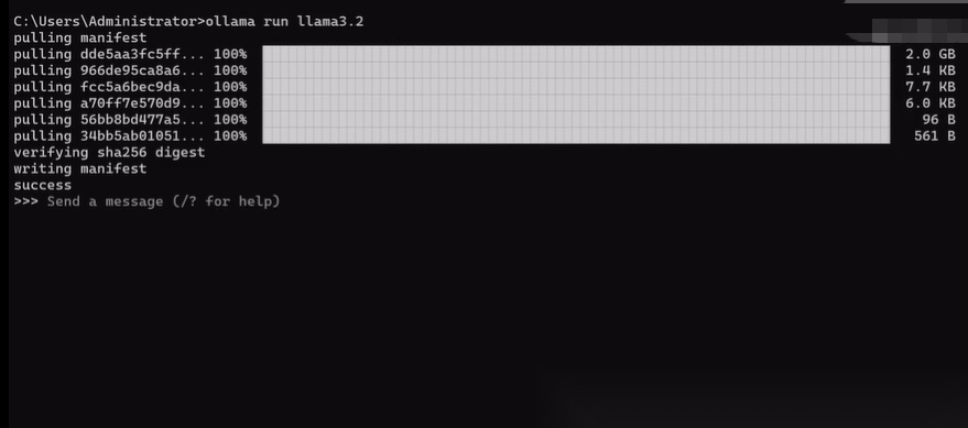 我们需要下载一个大模型文件,这里就以llama3为例来演示。注意,这里大家不要搞混了,Ollama是一个用来部署大模型的工具,而llama是由Meta推出的一个大语言模型,目前最新的版本是3.2,我们输入ollama run llama 3.2之后,回车就会自动下载和安装模型文件。下载完成之后,我们就可以在本地使用这个模型了。这里我们可以直接在命令行和他对话。输入“/bye”就可以退出对话。