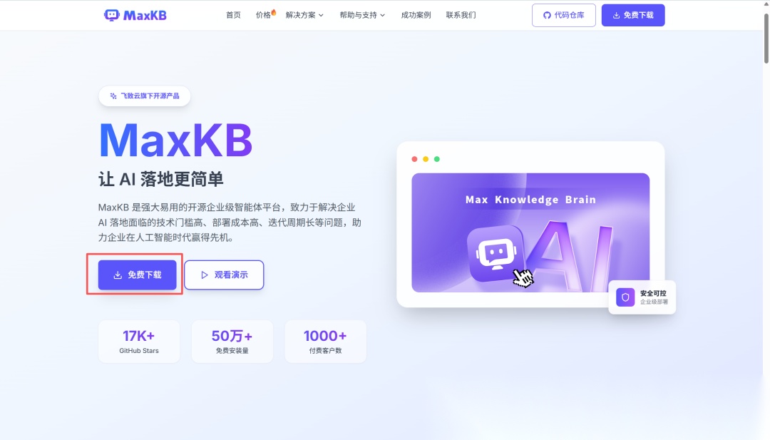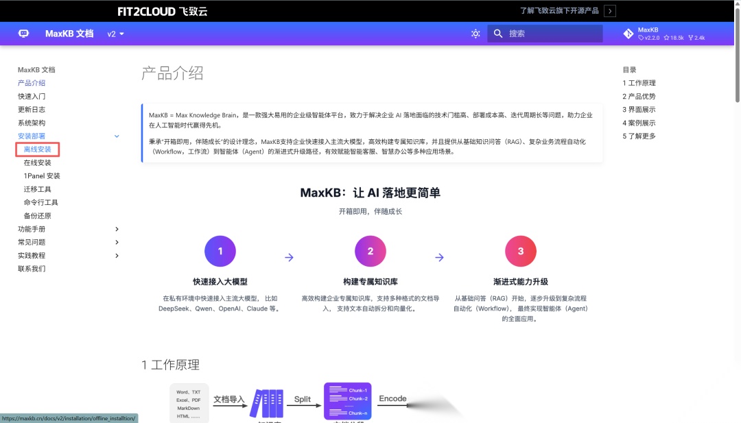 MaxKB就是这样一个基于大模型和Rag的系统,它的官方网址是http://maxkb.cn,打开之后,点击页面中间的下载安装按钮,就会来到它的官方文档页面。这里有非常详细的安装和使用说明。