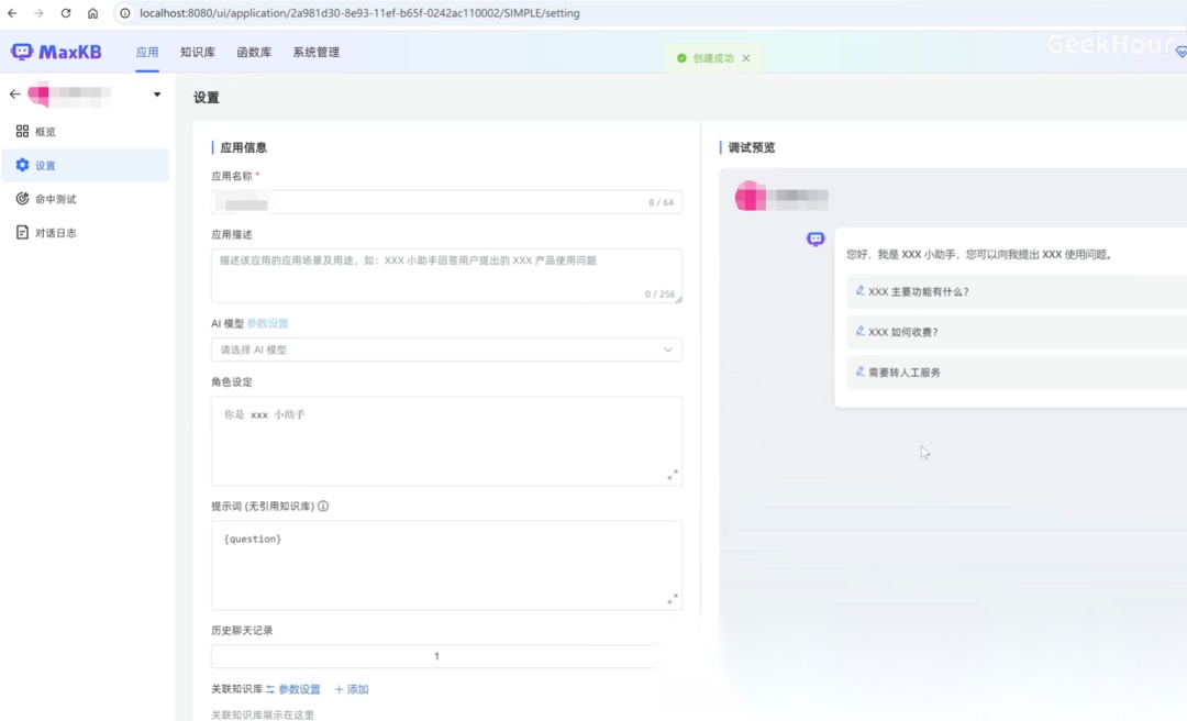 然后点击创建就会跳转到应用的配置页面,这里需要再配置一下使用的AI模型,选择我们刚刚配置好的llama3模型下面的角色设定以及开场白等内容,可以换成你对应的产品或者ID。然后就可以在右侧的测试输入框里面输入一些问题,比如来输入一个hello,稍等一下就可以看到他的回答了。