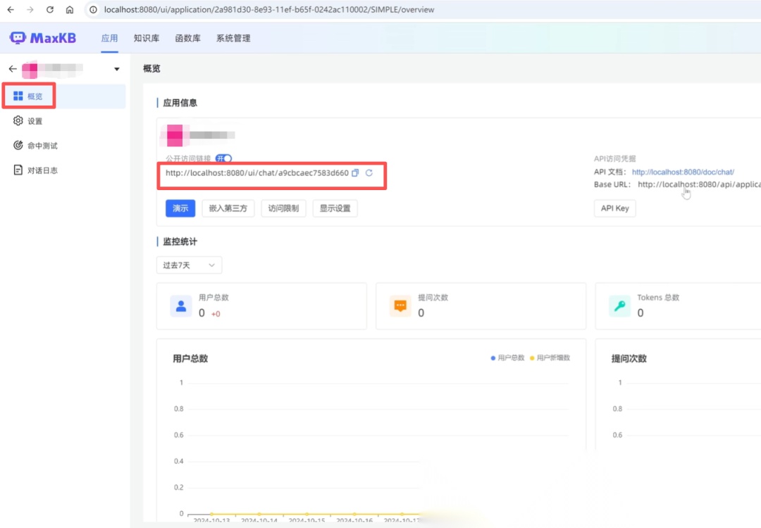 设置好之后,点击右上角的保存并发布按钮,这样一个应用就配置好了。在概览页面可以看到它的一些基本信息,包括它的公开访问链接,API接口地址以及一些监控和统计信息等等。