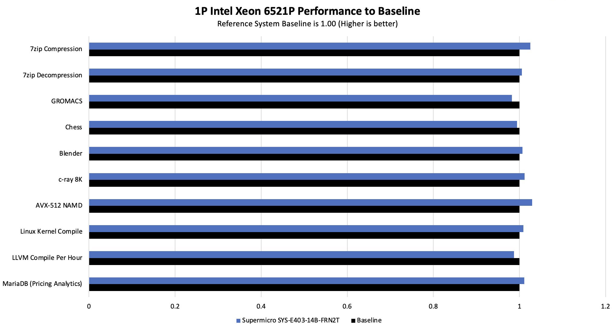 需要说明的是,至强 6521P 的 TDP 为 225W,而 SYS-E403-14B-FRN2T 的散热能力上限为 300W,两者之间留有充足余量。在持续负载条件下,处理器频率与性能输出表现稳定。