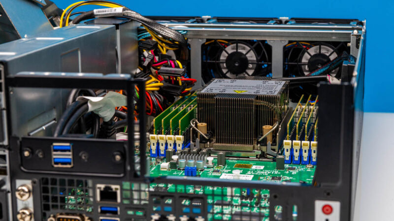打开顶盖后,可以直观感受到这台服务器在空间利用上的高度集成。机箱内的散热风扇为热插拔设计,方便在不影响系统运行的情况下进行维护。