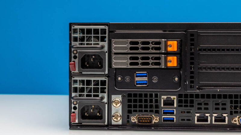 紧凑化的实现,很大程度上得益于其前置 I/O 架构。机身正面左侧集成冗余电源模块,并配备两个 2.5 英寸 NVMe SSD 热插拔硬盘位。相邻位置为两个 USB 3.0 Type-A 接口——在 E403 系列的部分型号中,这一位置仍为 USB 2.0,因此该机型在外设接入体验上有所提升。