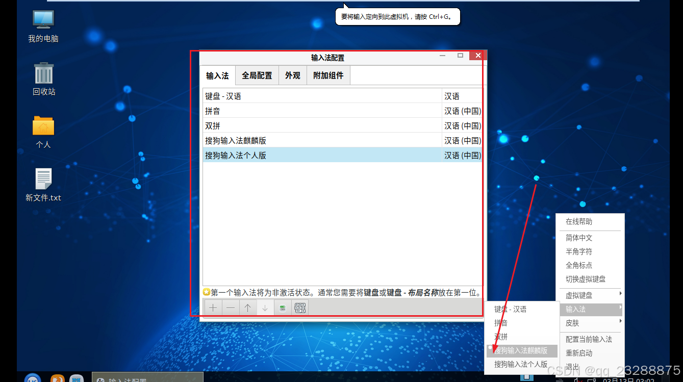 同样点击输入法可以查看当前使用输入法 ,配置输入法