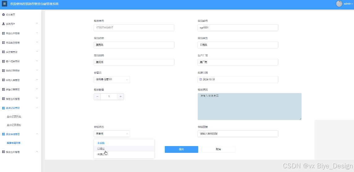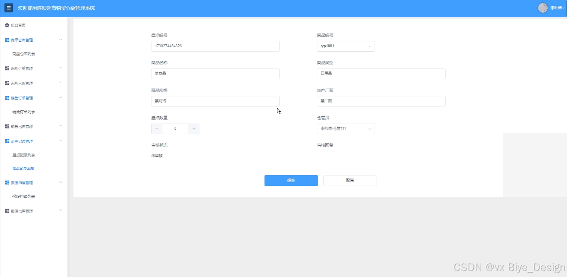 管理员可管理所有盘点记录信息的添加、更新、删除等操作,提供搜索功能。仓管员可增改删查自己的盘点记录信息,由管理员审核仓管员添加的盘点记录信息。