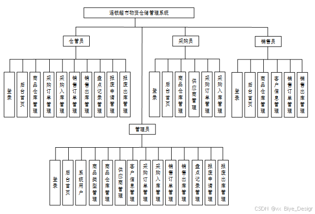 在设计基于分布式处理的连锁超市物资仓储管理系统时,功能需求分析是确保系统满足用户需求的关键步骤。本系统采取面对对象和模块化的设计方案,根据系统用户需求,系统的面对对象主要包括管理员、仓管员、采购员、销售员等用户角色,可以将系统划分为管理员模块、仓管员模块、采购员模块、销售员模块等四大模块。