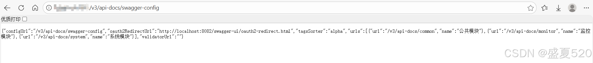 静态资源我们都已经放行了,所以我们在访问Swagger的时候,才会有Swagger UI界面展示出来。细心的朋友已经发现了,没错,/v3/api-docs/** 接口我们也已经放行了,也就是我们上面说到的 /v3/api-docs/swagger-config 展示数据的接口,那么就不存在被后端拦截的情况了。我们在浏览器直接访问Swagger的数据接口 https://公网ip:后端项目端口/v3/api-docs/swagger-config