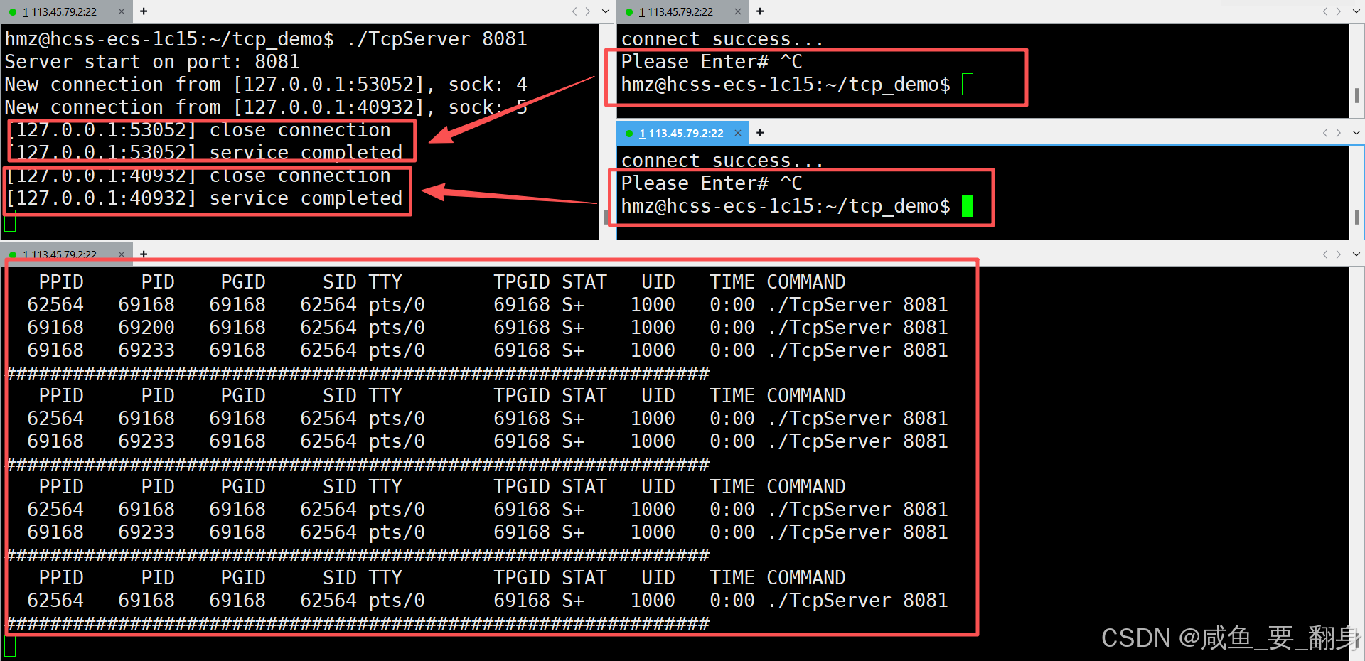 我们此时可以尝试关闭第一个客户端进程,然后我们可以看到服务端会等待第一个客户端断开连接后,才会处理并回显第二个客户端发送的数据: