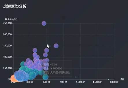 房源聚类分析图首先由系统从数据库中提取房源的面积和租金数据。接着,使用数据预处理技术对数据进行清洗和标准化,以确保数据的一致性和准确性。然后,应用随机森林进行聚类分析,将房源划分为不同的聚类群体。接下来,利用前端可视化库ECharts创建散点图,设置x轴为面积,y轴为租金。将聚类结果以不同颜色或形状的散点形式展现在图中,每个点代表一个房源,其位置由面积和租金决定。最后,将散点图嵌入到数据可视化面板中,用户可以通过交互式界面查看不同聚类群体的分布情况,从而直观地了解房源在面积和租金维度上的聚类特征。房源聚类分析界面效果图如图5-4所示: