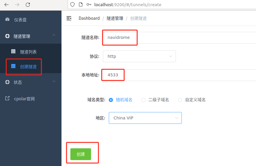 - 隧道名称:可自定义,本例使用了:navidrome 注意不要与已有的隧道名称重复