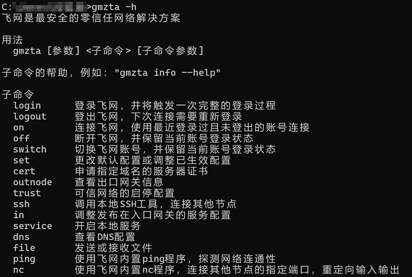 在命令行输入:gmzta -h,可以查看飞网的命令行工具的帮助信息。