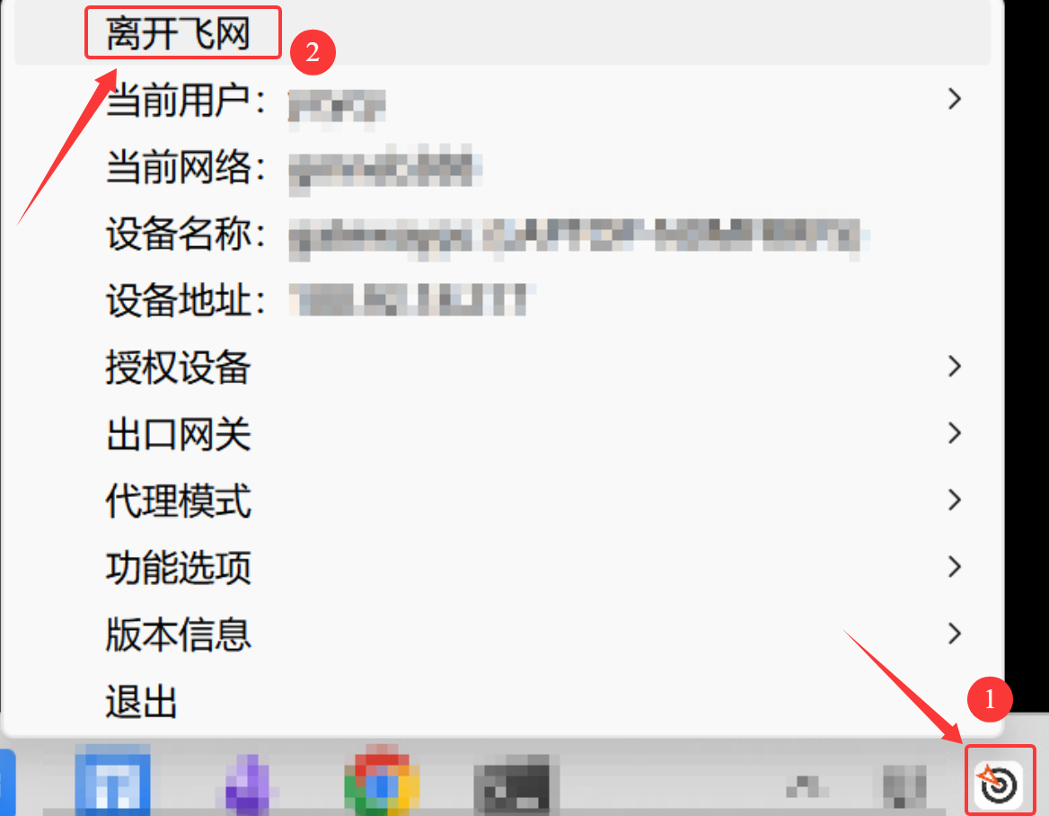 第一种方法:使用飞网客户端程序离开飞网。右击飞网图标,点击 “离开飞网”。