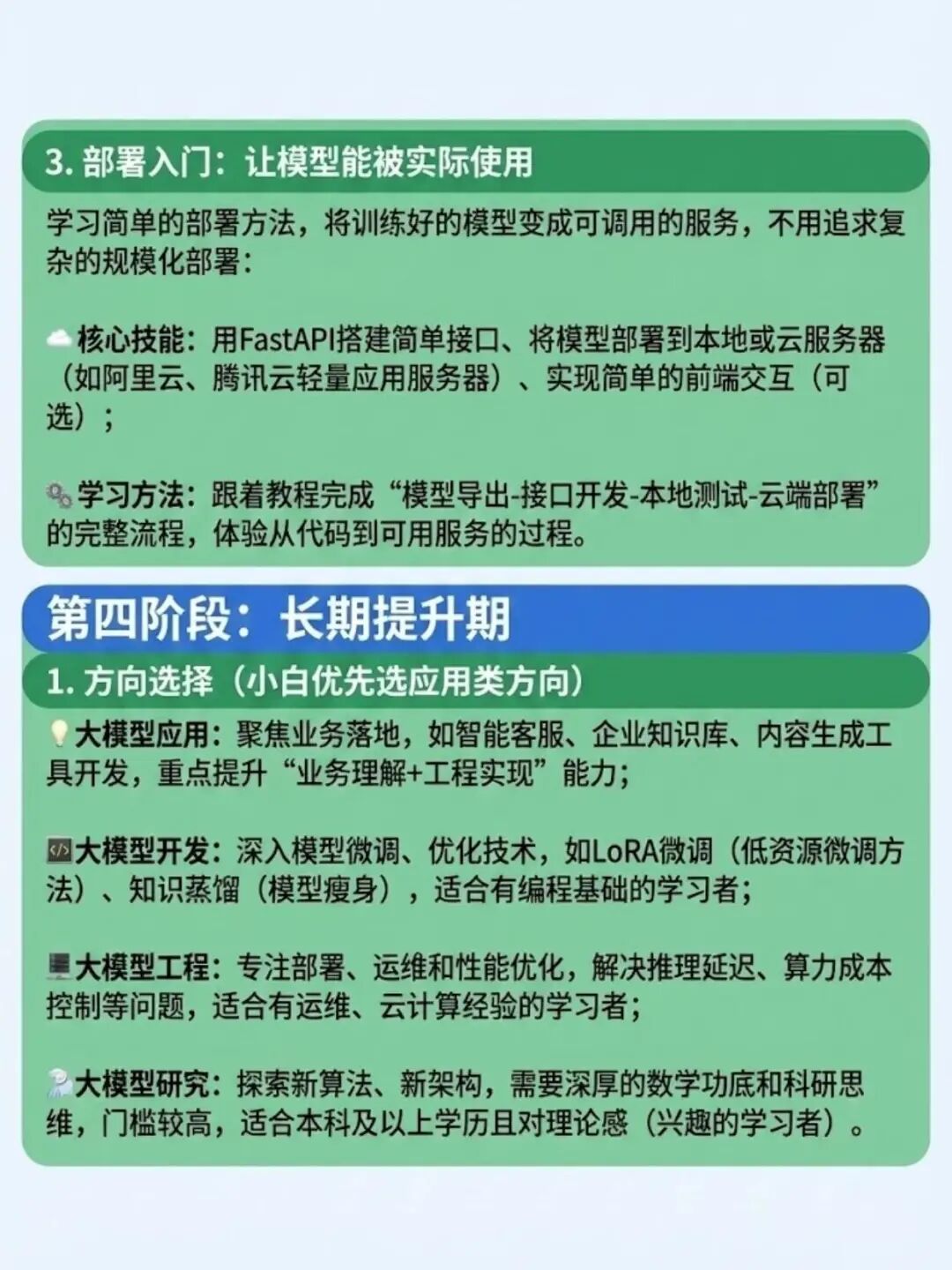 · 大模型工程方向:专注模型部署、运维与性能优化,如将模型部署到服务器、移动端,优化响应速度、降低部署成本,适合后端程序员转型;