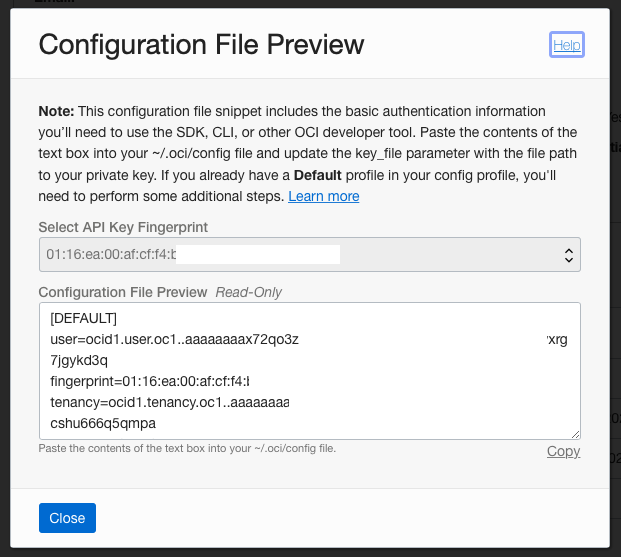工具需要一个配置文件来存储Oracle Cloud的认证信息。你需要创建配置文件并填入以下核心参数: