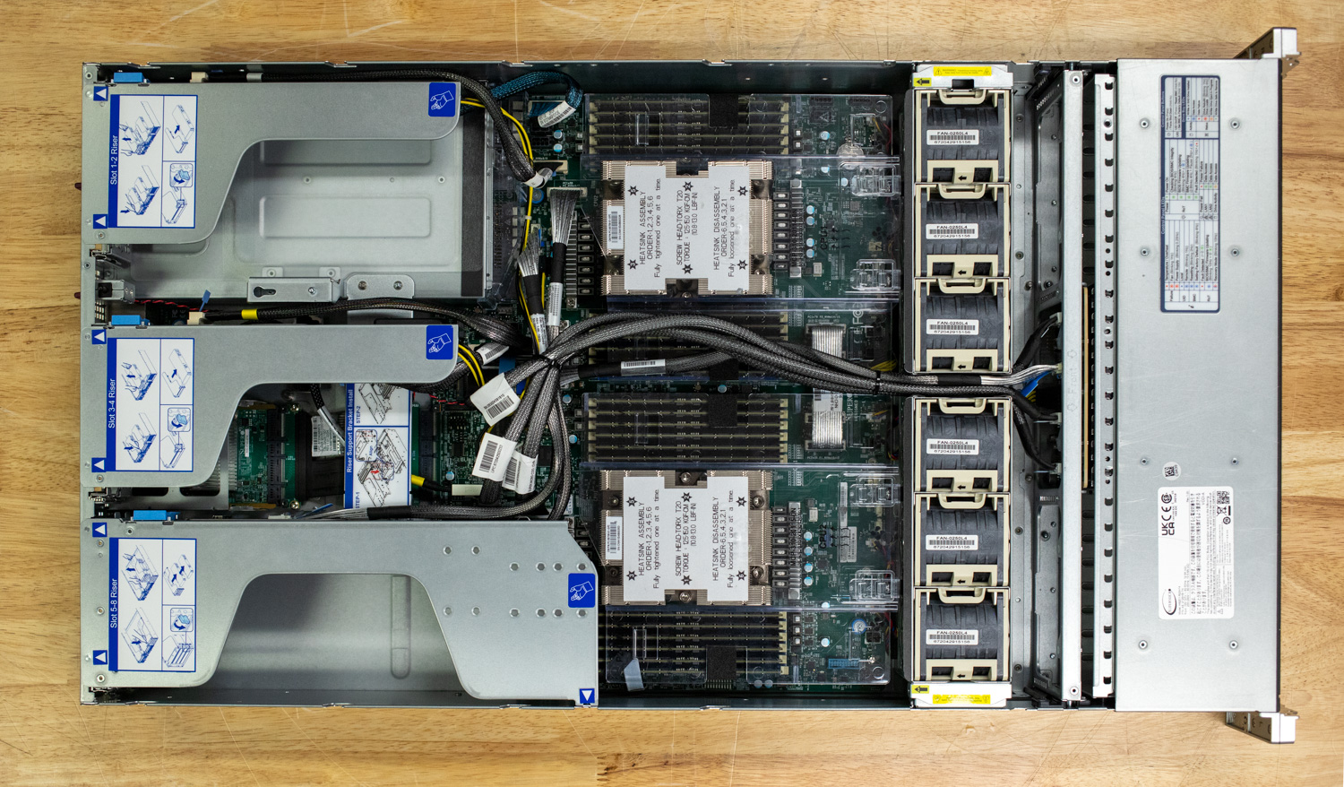 机箱后半段是PCIe扩展区,最多能装3块双宽PCIe 5.0加速卡——NVIDIA H100 NVL、RTX 6000 Ada、L4,或是AMD Instinct MI210都能兼容,因此非常适合计算密集型部署。插槽布局预留了足够的气流间隙,高负载下也能保证加速器的散热稳定。