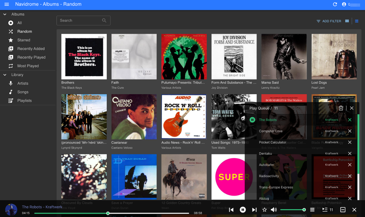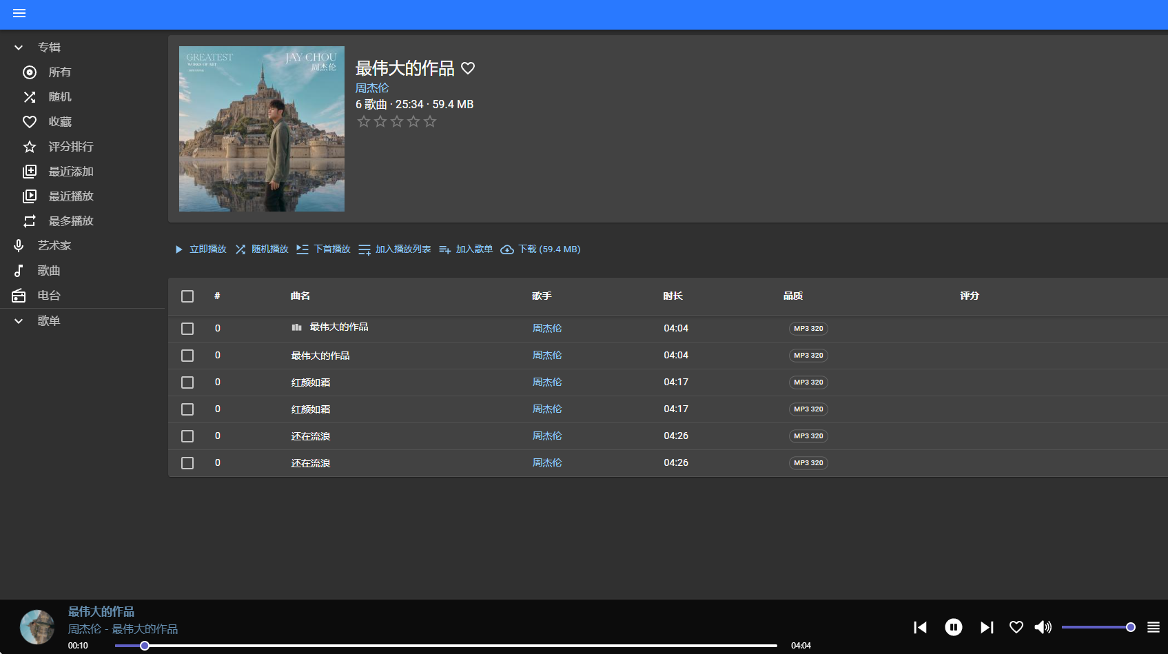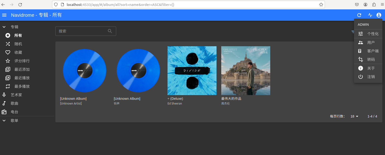Navidrome 会自动扫描你存放在上边设置的真实存储路径中的音乐,并自动将歌曲分类为各个专辑的形式展现: