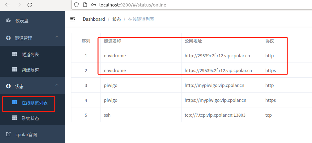 创建成功后,打开左侧在线隧道列表,可以看到刚刚通过创建隧道生成了两个公网地址,接下来就可以在其他电脑或手机平板(异地)上,使用任意一个地址在浏览器中访问即可。