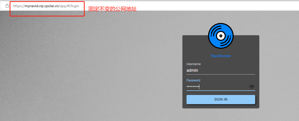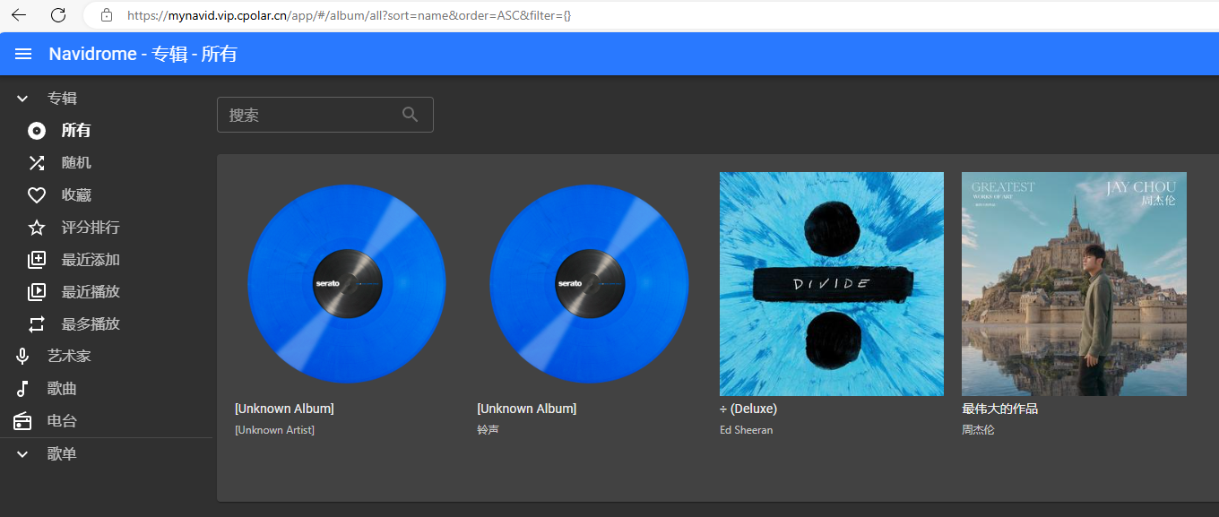 最后,我们使用任意一个固定公网地址在浏览器访问,可以看到访问成功,这样一个固定且永久不变的公网地址就设置好了,随时随地都可以远程访问本地部署的 Navidrome 音乐服务器来听音乐了!