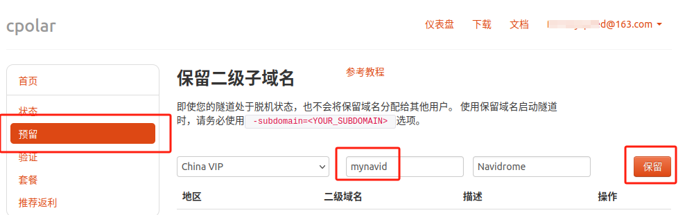 登录 cpolar 官网,点击左侧的预留,选择保留二级子域名,地区选择 China VIP,设置一个二级子域名名称,点击保留,保留成功后复制保留的二级子域名名称,这里我填写的是 mynavid,大家也可以自定义喜欢的名称。