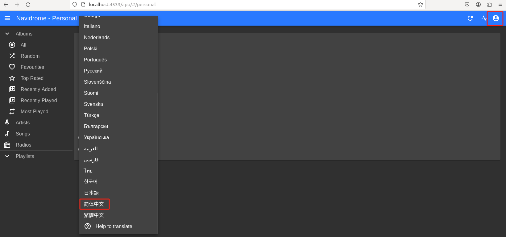 登录后,点击界面右上角的头像图标进入个性化,可以设置语言为中文: