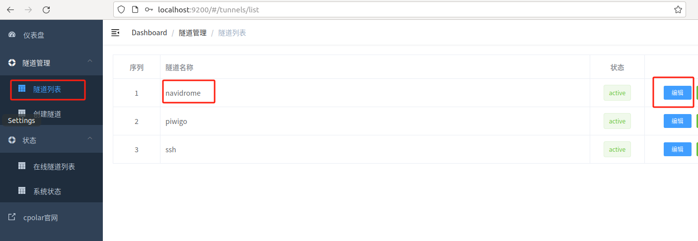 保留成功后复制保留成功的二级子域名的名称:mynavid,返回登录 Cpolar web UI 管理界面,点击左侧仪表盘的隧道管理——隧道列表,找到所要配置的隧道 Navidrome,点击右侧的编辑: