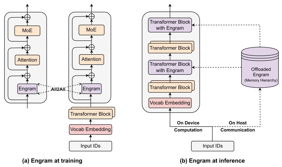Engram模块基于现代化N-gram嵌入设计,整合了分词器压缩、多头哈希、上下文门控、多分支融合等关键组件,先通过分词器压缩降低词汇冗余、提升语义密度,再利用多头哈希对后缀N-gram进行O(1)快速检索,结合上下文门控根据当前语境动态调节静态记忆的权重以抑制噪声,同时适配多分支Transformer主干架构,通过“核心参数共享、分支细节定制”平衡参数效率与表达能力。系统层面,Engram通过训练时GPU分片存储与All-to-All通信、推理时主机内存预取与多级缓存,实现计算与内存的解耦,突破GPU内存限制且推理开销控制在3%以内。