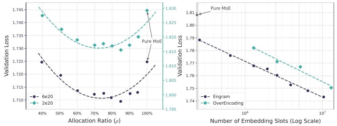- 固定参数和计算量下,MoE专家与Engram内存的稀疏容量该如何分配?