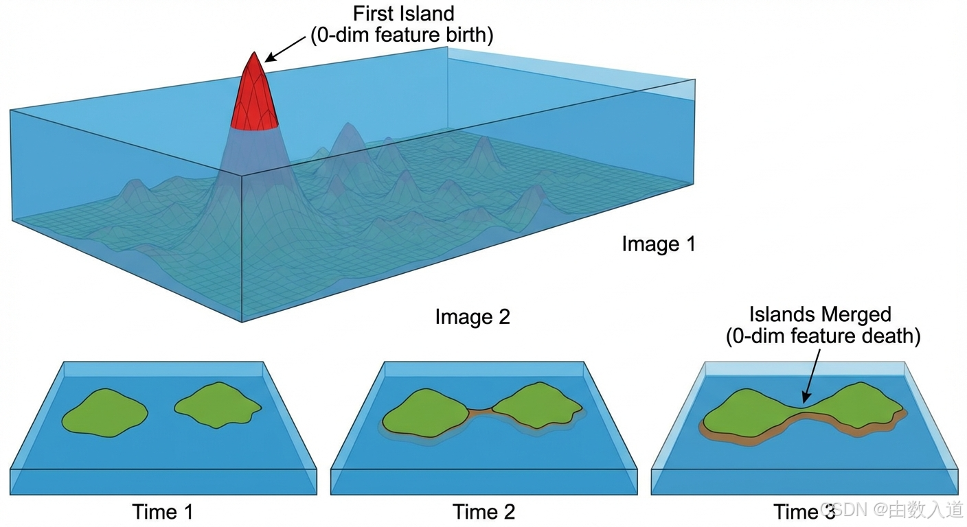 - 拓扑数据分析(持续同调)则会问一个截然不同的问题:“这个岛屿是一个完整的大陆,还是由几个小岛组成的群岛?岛上有没有内陆湖?” 这就是在探究数据的形状。