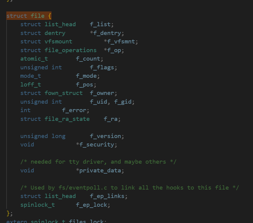 可以看到,struct files_struct包含着一个数组fd_array。数组元素是struct file*类型,这个结构体类型,就对应着每一个具体的文件,里面包含着文件各种详细属性!